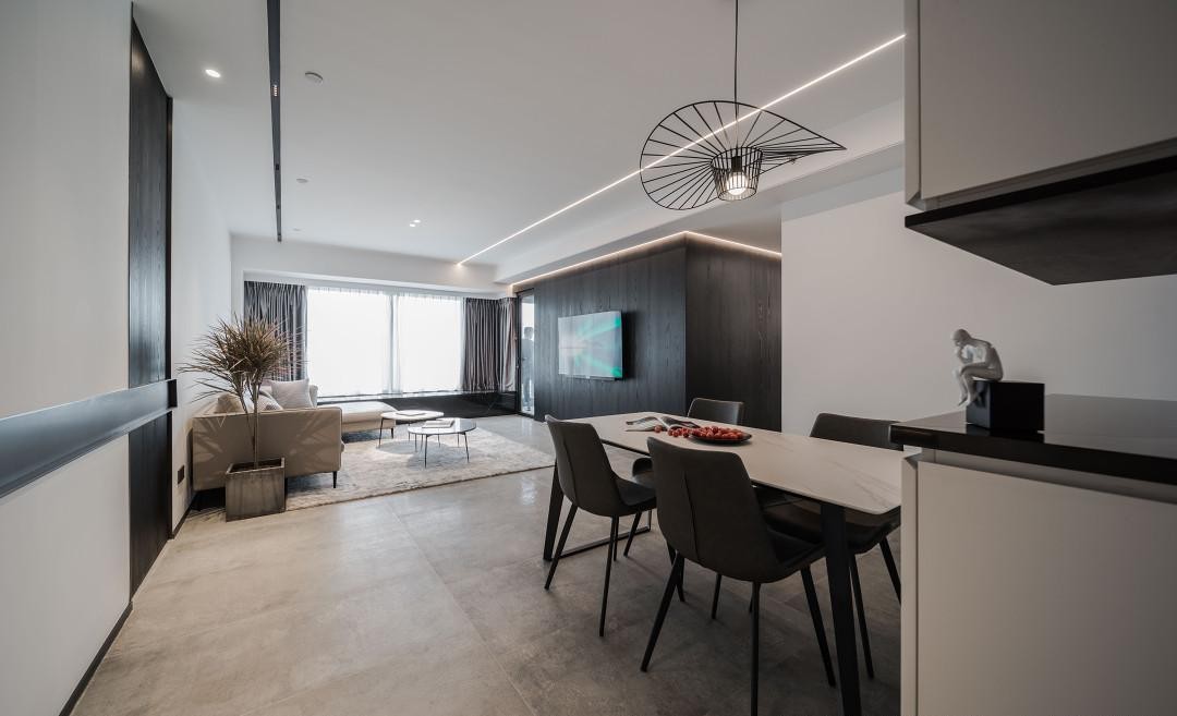 客餐厅联动的空间中,整体色彩极为朴素,黑白的色彩仿佛是钢琴的琴键,地面砖也用了哑光的地砖来提升质感。
