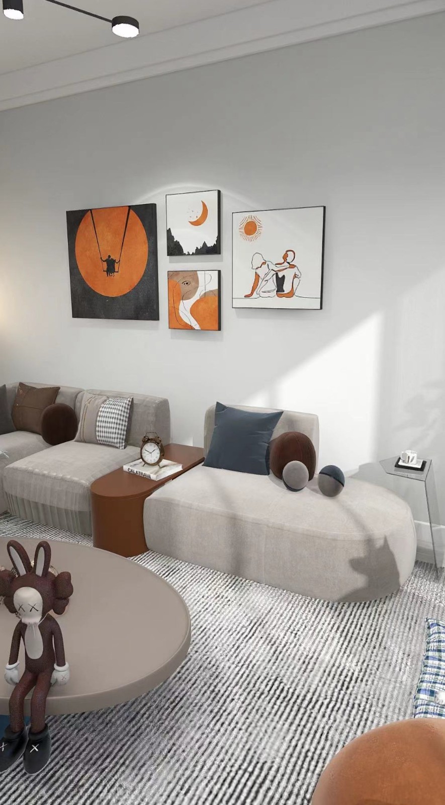 整体以白色打底,优雅淡然,藕粉灰与亮黄色、咖色的点缀;使空间更具特色。
