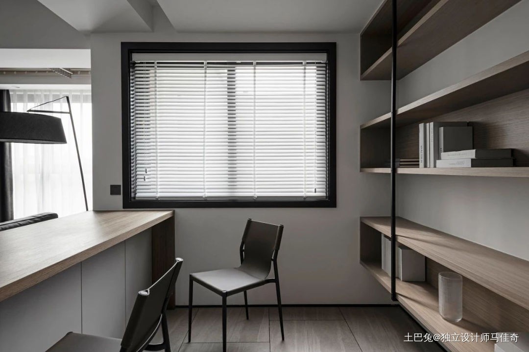 客厅和书房联通后,空间增大,安装了两台中央空调,利用沙发背后的墙体做了吧台,可早餐,也可以用作书桌,围绕墙体包裹而成的吧台,成为客厅和书房的介质,虽只是材质的区别,却实现了更多的功能体验和视觉转折点。