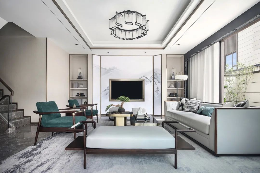 客厅电视墙中间岩板+两侧展示柜的组合,沙发也不是直对电视墙,整体现代典雅的风格设计,让客厅显得充满雅韵端庄的***感