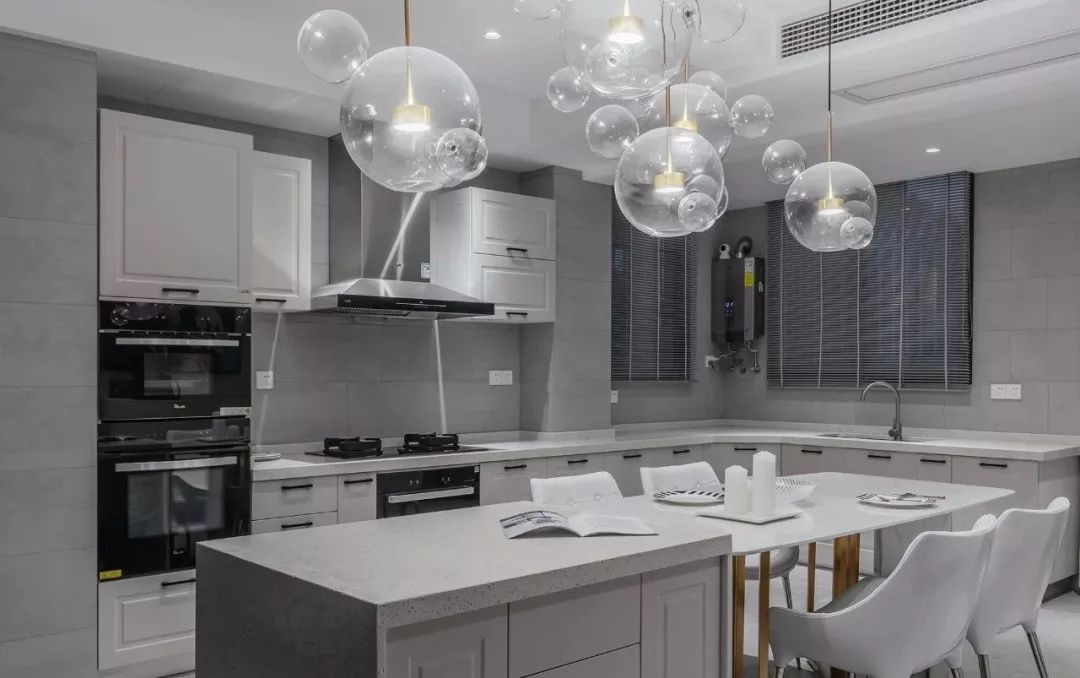 房子的格局算是比较端正的,设计师选择了以灰色调作为主色,加入优雅而又精致的软装,来营造出一个轻奢有格调的居住氛围,尤其是这个开放式的餐厨,让人感觉真时尚。