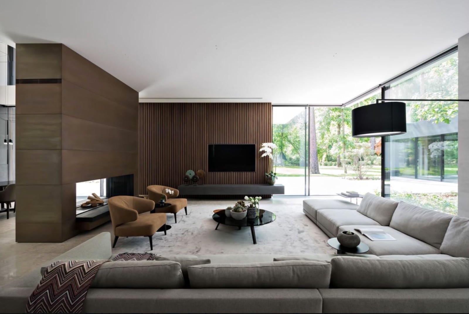 灰色调复古调性沙发,传递出空间安静气息。灰色与原木纯净色彩,营造出自然和谐质感。大面积的落地窗将阳光纳入满室,温暖悠长,静谧舒适。