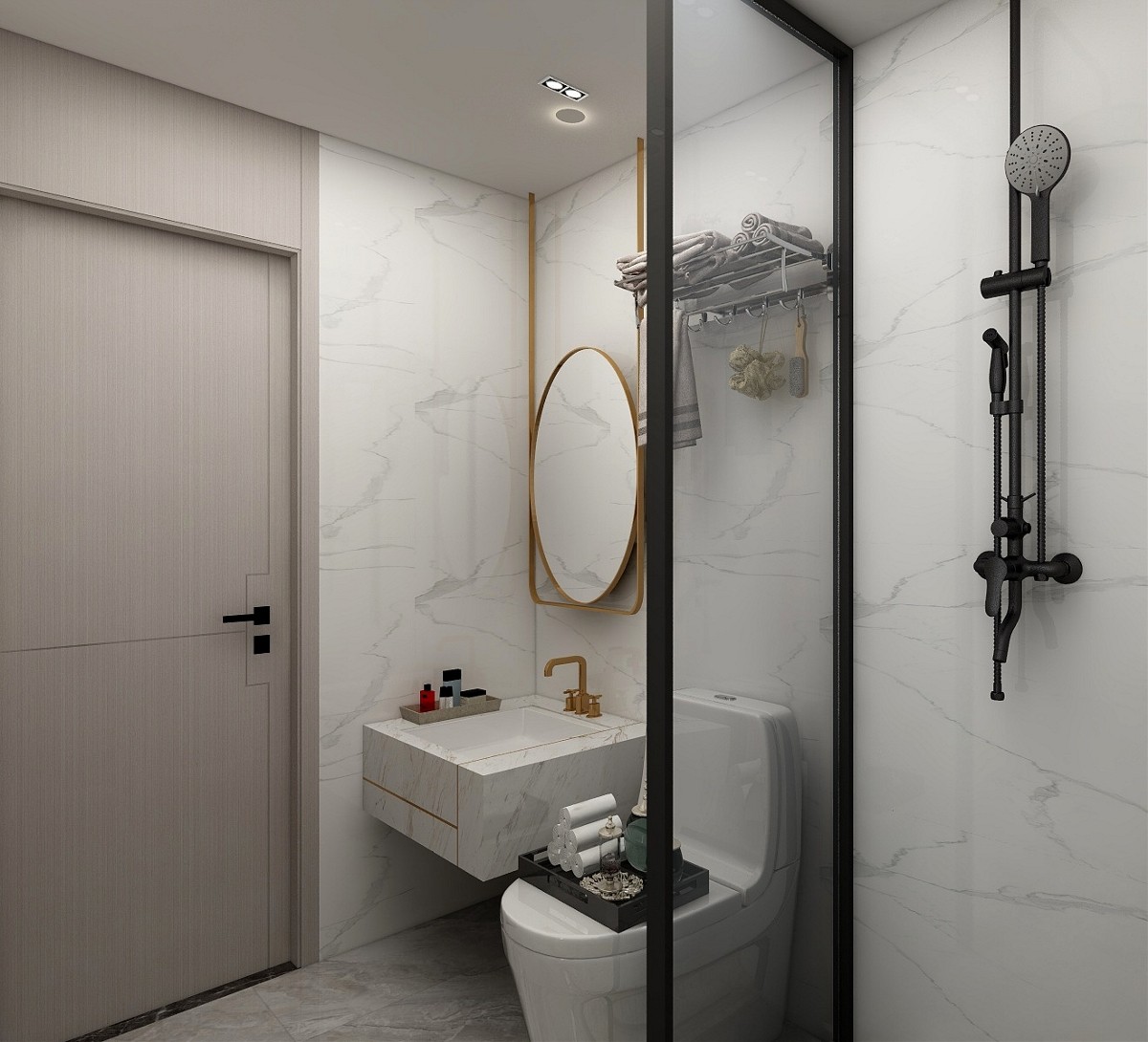 干湿分离卫生间,玻璃隔墙隔出淋浴区。