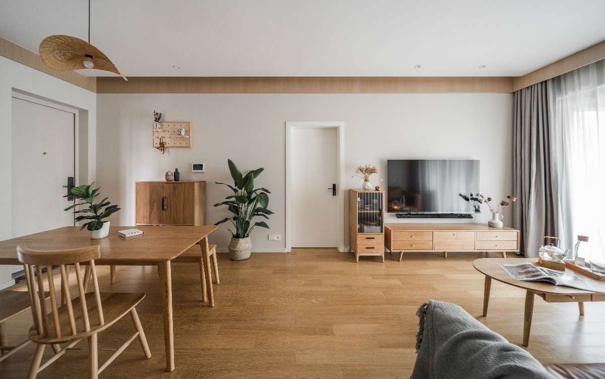 客厅空间以浅暖灰和原木色搭配,清新温柔。
