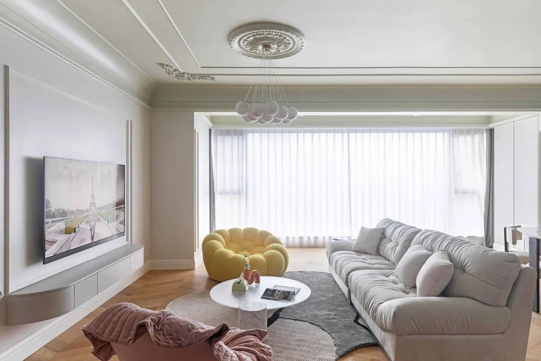 客厅整体简欧风的空间基础,天花以凸造型+装饰的设计,布置上舒适的浅灰色布艺沙发、粉色与黄色搭配的沙发椅、懒人椅,也让空间显得更加俏皮而情趣。