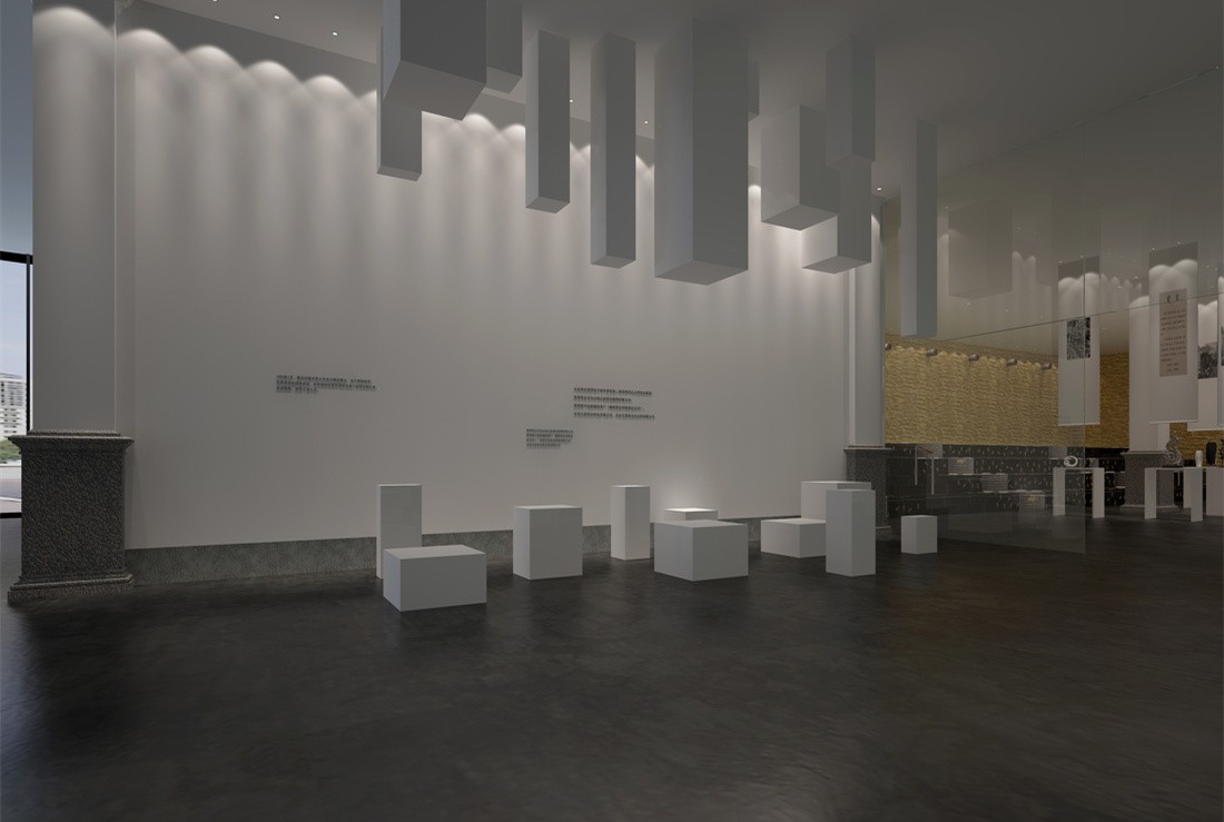 本案是某茶的展览馆设计,展览馆包含接待区、展览区、体验区、交流区、办公区、内庭院以及一些配套功能。接待区的的弧形墙面和弧形接待台形成了一个有聚合感的空间;进入展览区域内,屋顶挂有长短不一的矩阵和印有茶文化历史的画轴;墙面使用的特殊材料,形成土坯效果;简洁的白色展台;徽派屋顶装饰的展览柜;天然石材堆砌的圆形桌椅;多元素多趣味的设计使得展厅内的每一个空间在带给人们不同视觉体验的同时,又深刻的传达着茶文