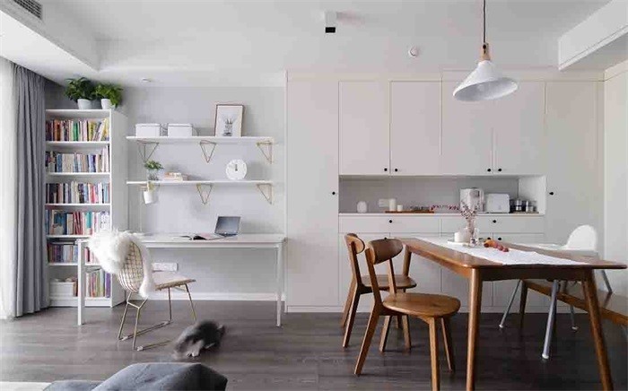 客厅、餐厅、书房三者之间没有任何的阻隔,空间采光得以释放,视野一览无遗,厨房的半开放设计,让空间的通透感覆盖了整个公共区域,让这个原本不大的空间开阔了许多。
