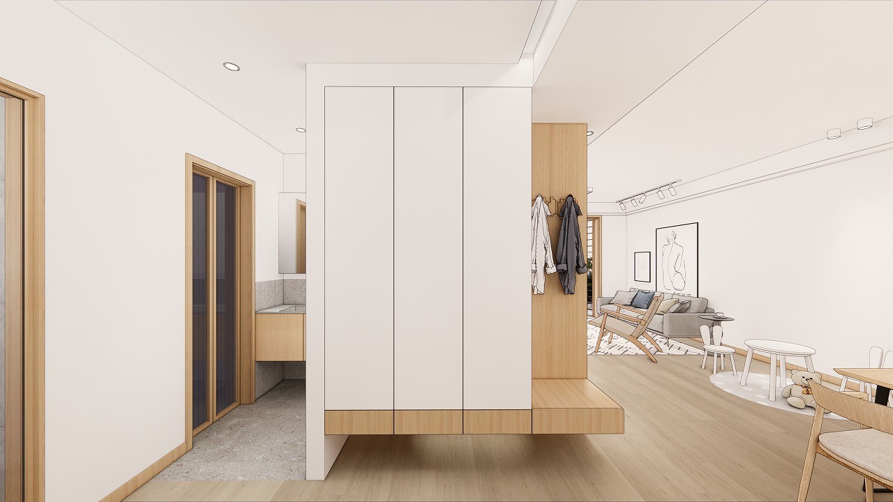 玄关柜预留挂衣区,同时也可以用作换鞋凳
