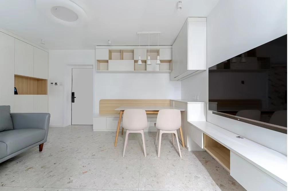 客厅采用间接采光,整体以白色为主,地砖采用了大块花纹的水磨石,用来活跃空间。