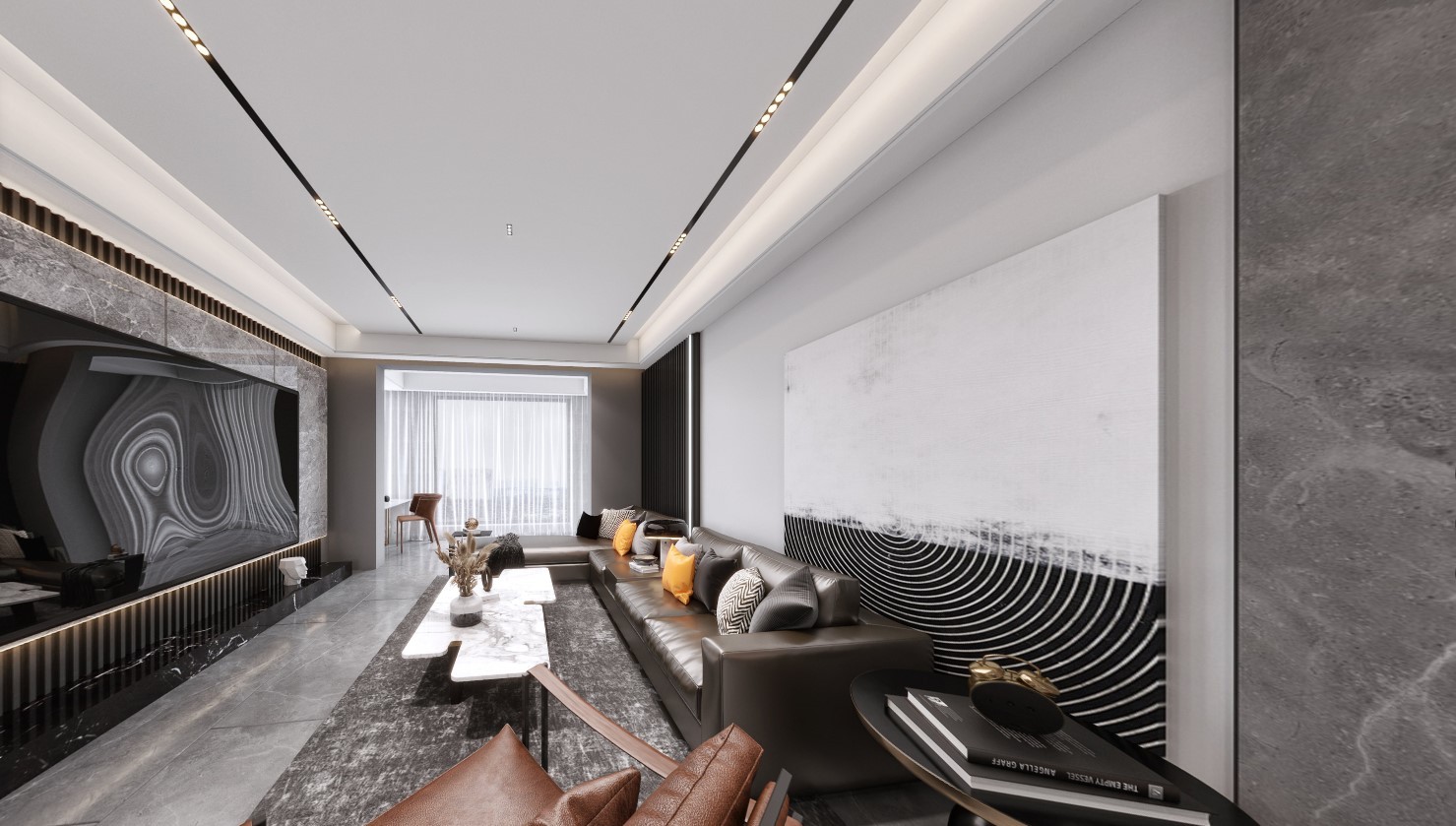 客餐厅常用***黑与***灰做为表现,尤其黑白的对比鲜明,爱马仕橙点缀总给空间一种时尚大大方方的利落感。