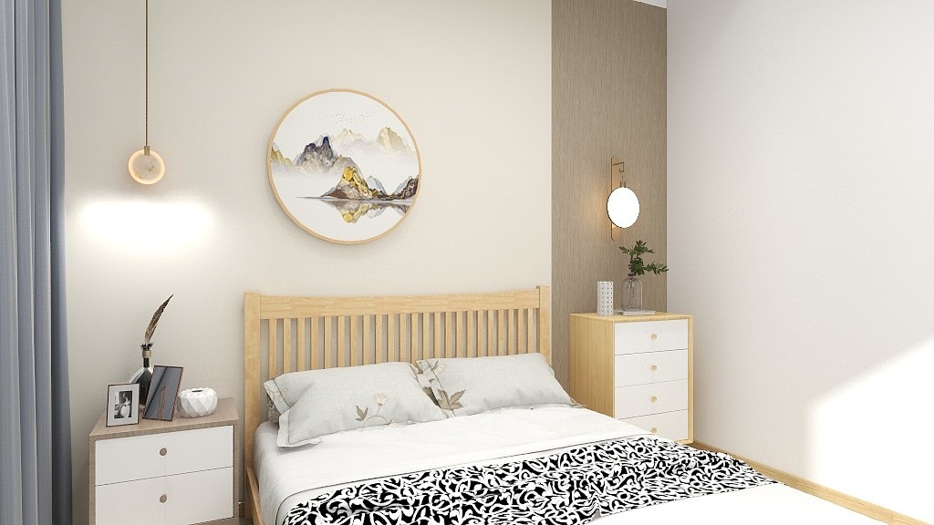 背景墙选用壁布撞色,看上去拉高了整体氛围感,小壁灯可以代替床头灯使用
