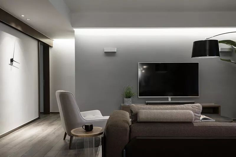 客厅电视背景墙刷成了灰色,暖灰色的沙发和米白色的休闲椅结合,黑白灰为主的客厅空间给人一种简约的格调感。
