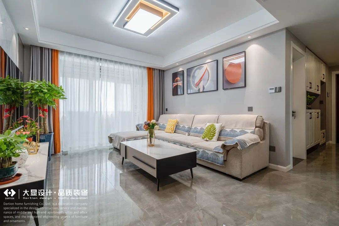 客厅是传统的“沙发-茶几-电视”设计,三世同堂的审美妥协又和谐。宽敞大方,棉麻白色七字长沙发,围合成一家人围炉夜话的氛围,可看电视聊天消遣闲暇时光。
