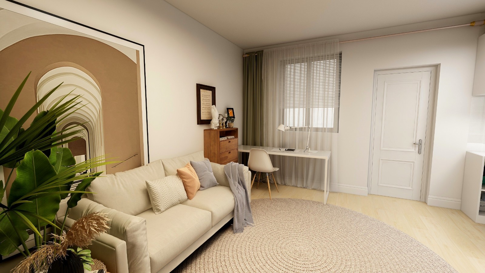 保留一些原有的家具,再买一些相对柔和色系的地毯及装饰画进行搭配。
