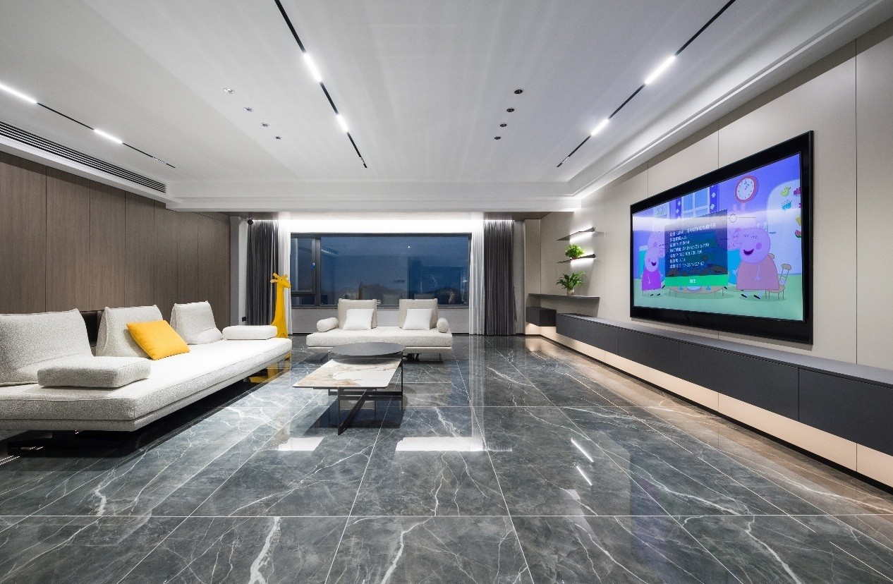 设计面积:265平方米 设计风格:现代轻奢风 所用材料:灰色大理石地砖、极简灯带、乳胶漆、护墙板、硬包等
