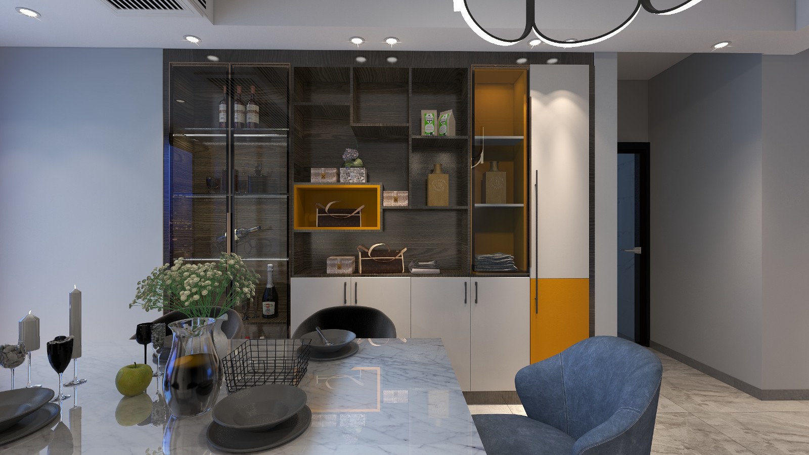 客餐厅整体有六七十个平方,墙面主色彩是太空漫步灰,佐以业主喜欢的彩色作为提亮色。