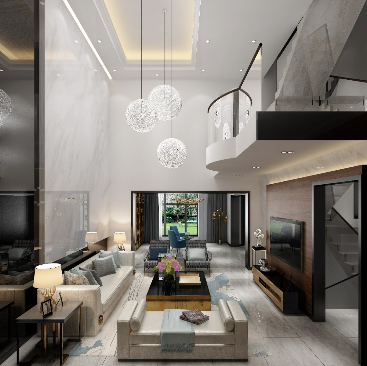 白色的大理石承载,温润的木饰面包裹,自然而温暖,高低错落的圆圈吊灯悬挑下来,多了一分随性和趣味,大幅画作诉说一分深邃和悠远意境