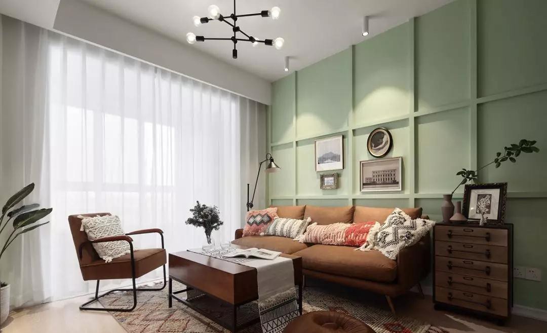 沙发背景的清新绿色很养眼,如春天发芽的绿叶一般,充满了生机与活力。棕色的沙发、木色的茶几与边柜,还有地毯,有些复古和味道,从中可以感受到岁月的痕迹。