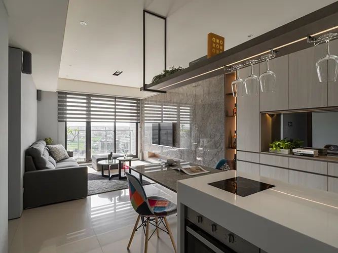 以现代极简风的装修,空间内的硬装与家具有着良好的结合互动,使得整体空间的设计和谐统一而大气