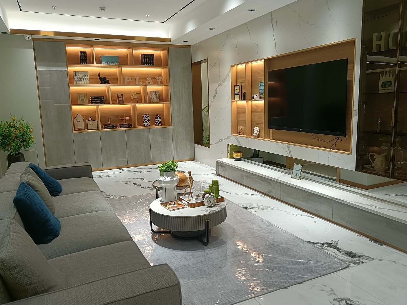 电视背景墙砖上墙,做了造型,还可以储物。