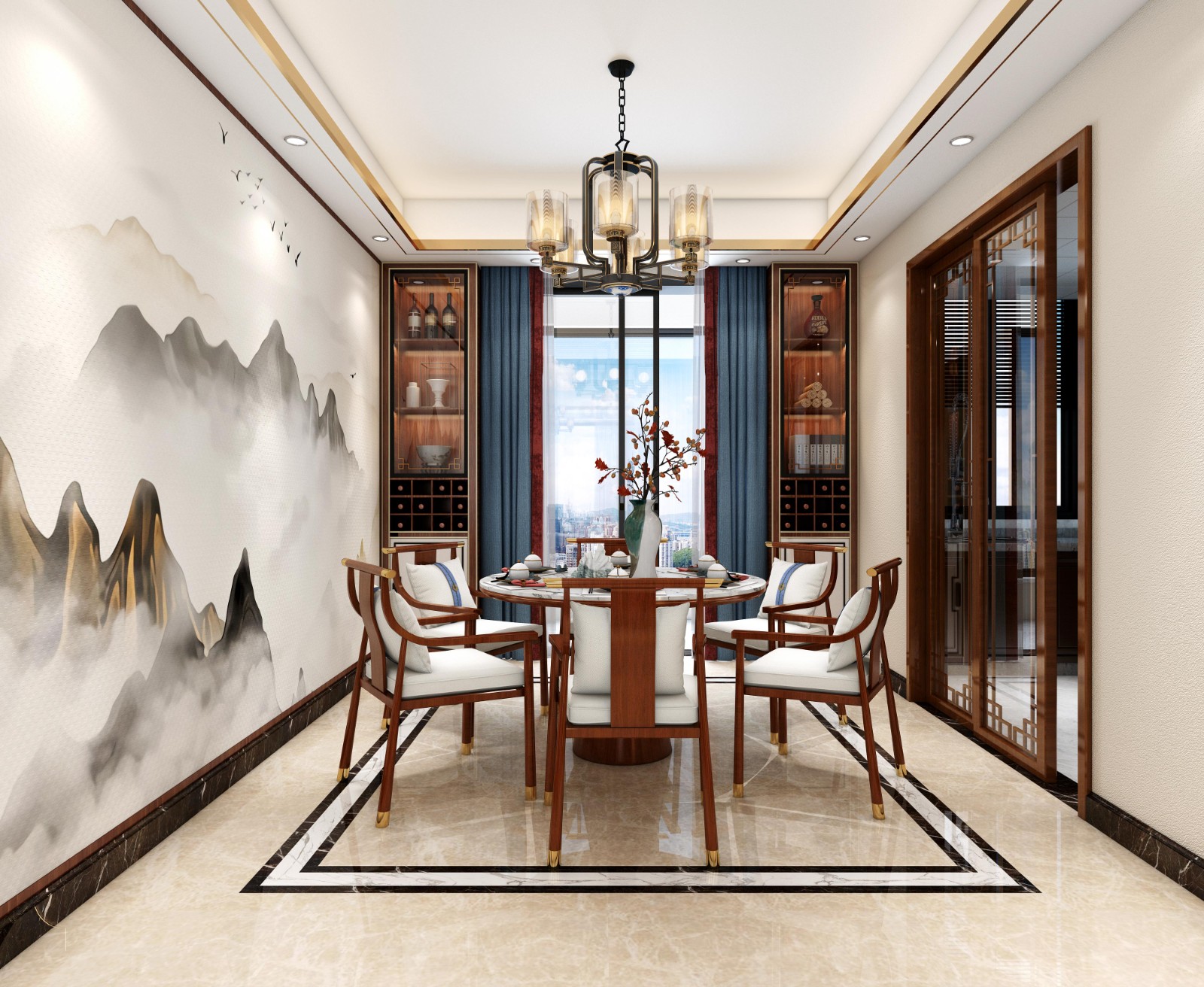 整体以新中式风格为中心,打造出一种诗意而有韵味的空间感。设计并不是单一的复制,而是尊重传统、追溯本源,以稳重和平为特征,体现东方的传承和时光的印记。