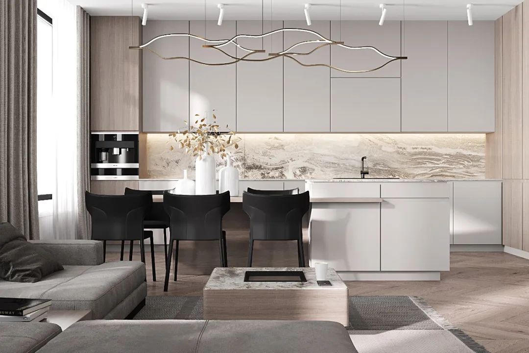 在岛台建造了一个酒柜,Terrasvet的平板灯像轻云一样盘旋在餐桌上空。其次,这种实木复合地板耐磨,这对于厨房和客厅等人流量大的房间来说非常有优势。