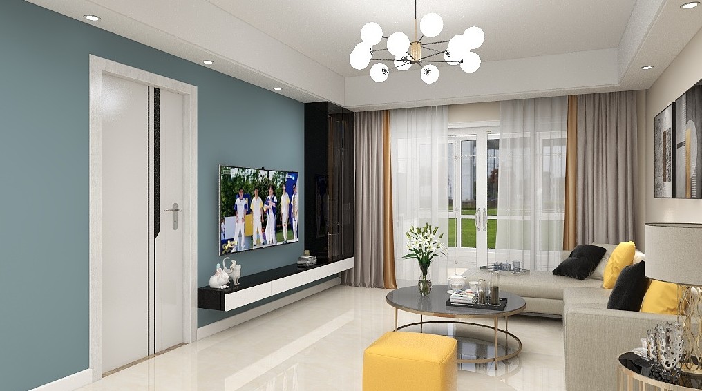 客厅主色调是暖色调,冷色调电视背景墙显得格外的清新