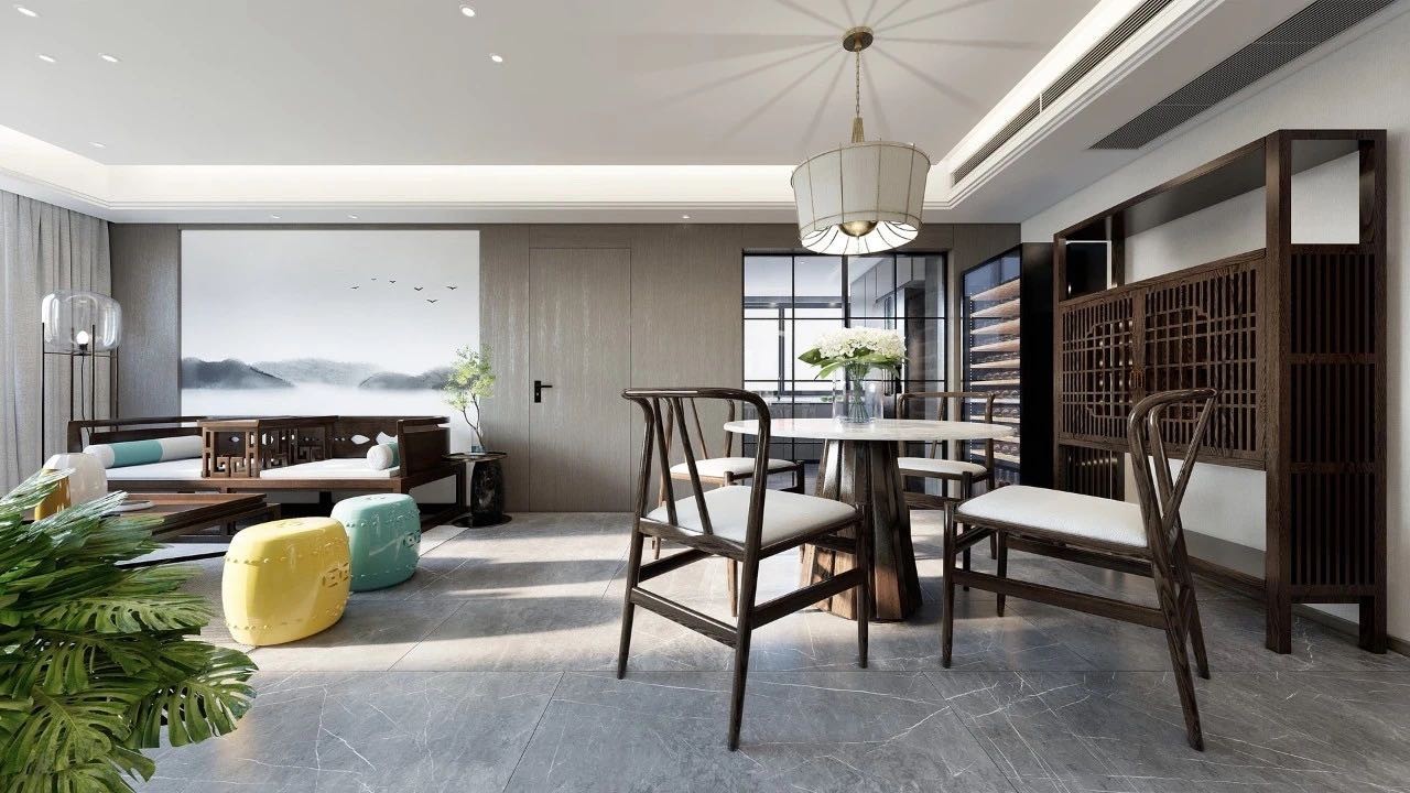 木饰面的墙面,让空间更有质感,而重点区域,局部留白(或铺贴传统写意山水的壁画墙布),则创造“萧散简远,秒在笔画之外”的意境之美,呈现出东方文化的空灵、质朴和寂静