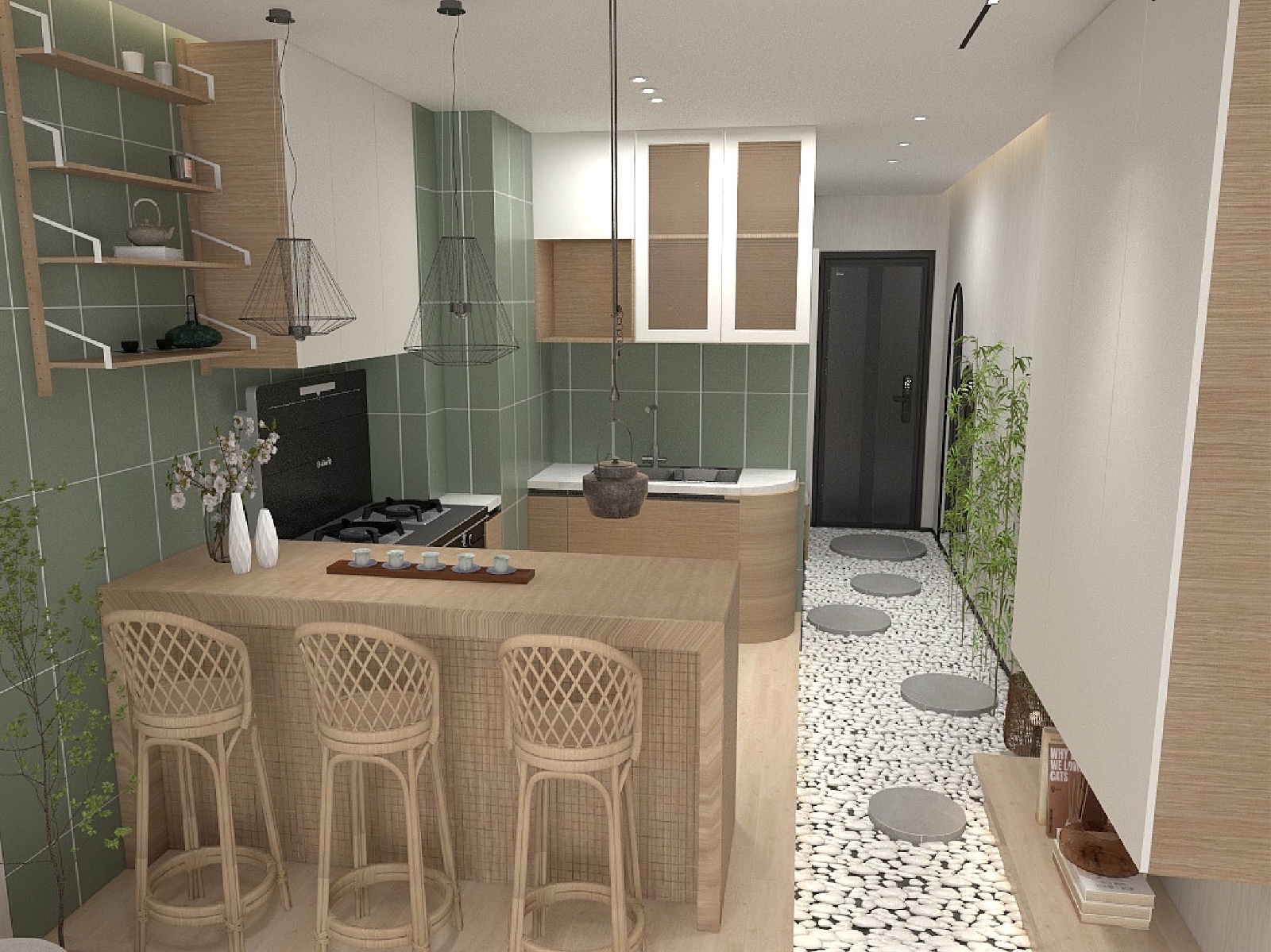 以鹅暖石铺走道增加日式端景,抬高厨房地面做地台区分空间