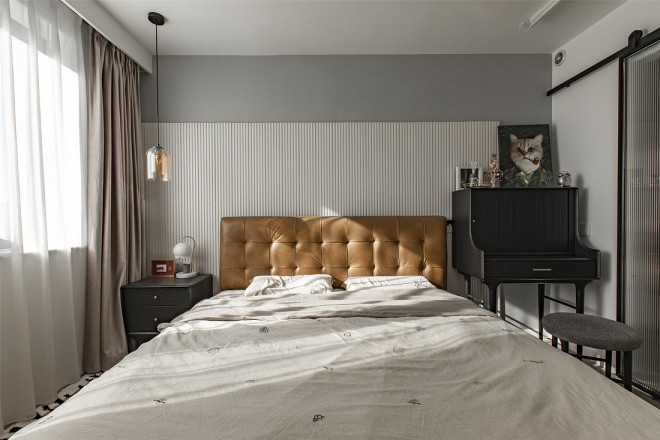 主卧的配色灵感,也源自于北欧风常用的莫兰迪色系,雅灰、暖白、经典黑调,调和出一个零负担感的睡眠空间。