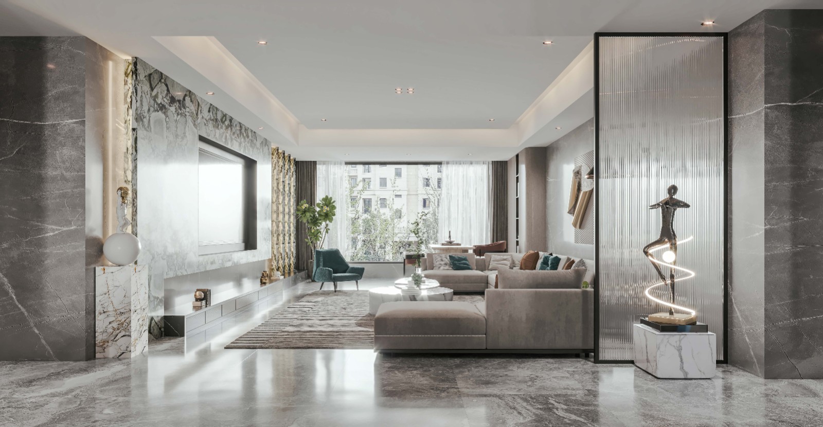 110平米的现代轻奢风格装修案例中,整体以现代大方的空间基础,在轻奢范的细节元素搭配下,配上独特大胆的颜色,让空间充满了时尚优雅的华丽气质。