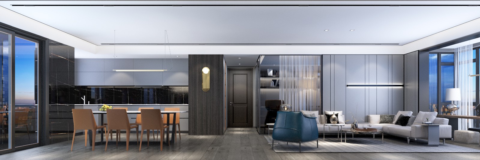 设计师让客厅与厨房餐厅以半开放式的布局处于同一空间