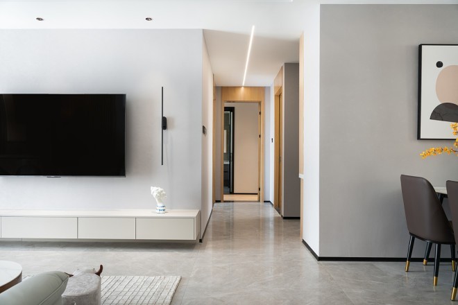 电视背景做了满墙深度350mm的收纳柜,结合悬空抽屉柜,延续极简造型设计,让收纳于无形,给收纳消消肿。既可以收纳书籍,又可以做旅行纪念品展示区,空间整洁不凌乱。采用中央空调系统,舒适度会更好。