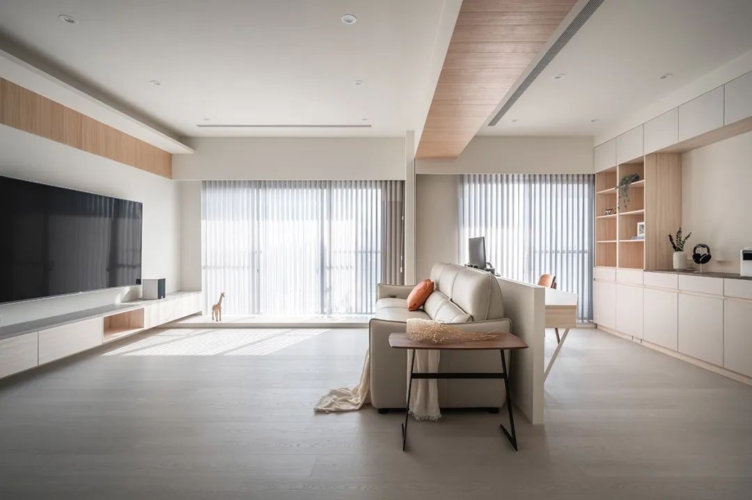 客厅拆除隔墙后,空间变得开阔许多。纯净柔和的色调搭配,营造出舒适的空间氛围。舍弃了厚重的茶几,以轻巧灵活的边几取代,空间更宽敞灵活。