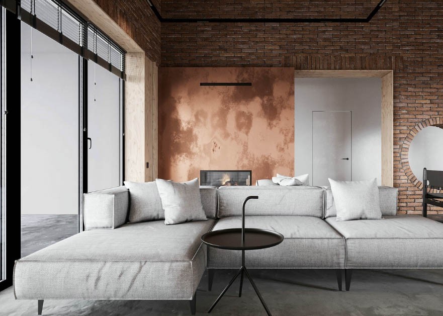 客厅背景墙采用橘色色调,搭配红砖铺砌的墙面,复古时尚。