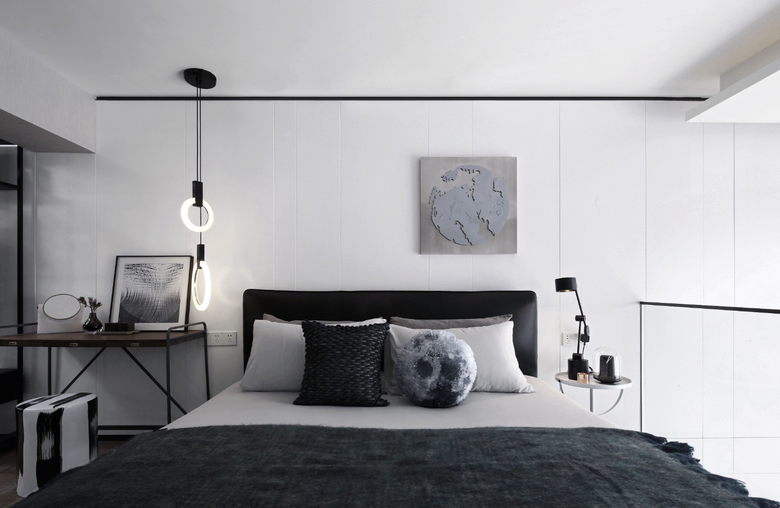 采用黑白灰色为基调,大面积白色烤漆背景墙面与灰橡木地面搭配,简约大方。辅以黑色金属材质装饰,硬朗而精致。错落有致的陈设,个性且具有艺术风尚的饰品贯穿其间, 凸显细腻精致的空间质感。