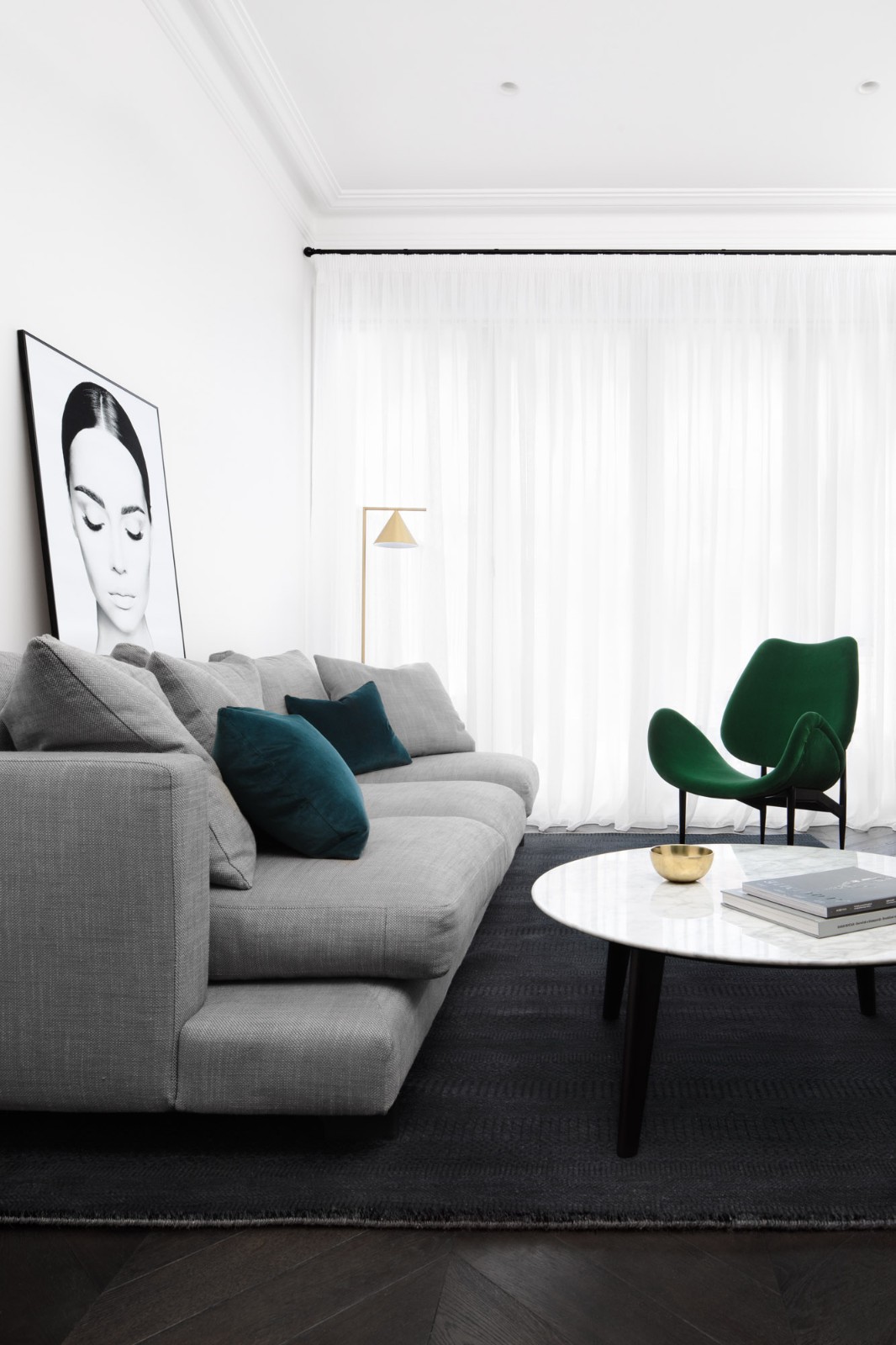 现代简约风,以还白搭配,,客厅布沙发,搭配白色窗帘。