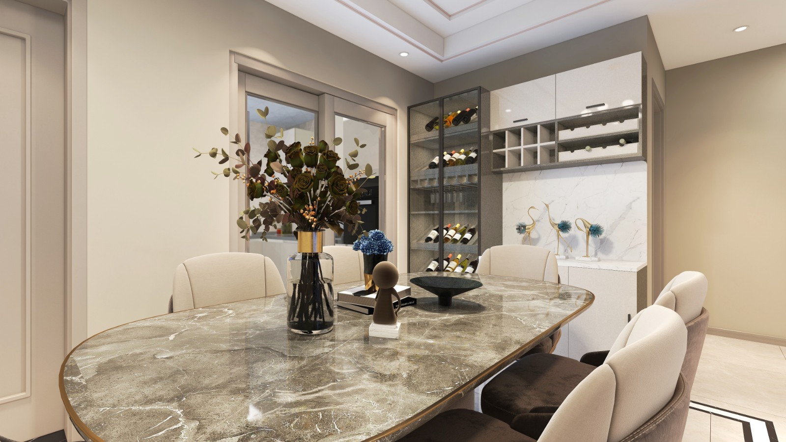 在现代简洁的视觉基础上,隐藏着贵族的气质,通过典雅大气的家居配色、精致华丽的软装配饰体现出来。