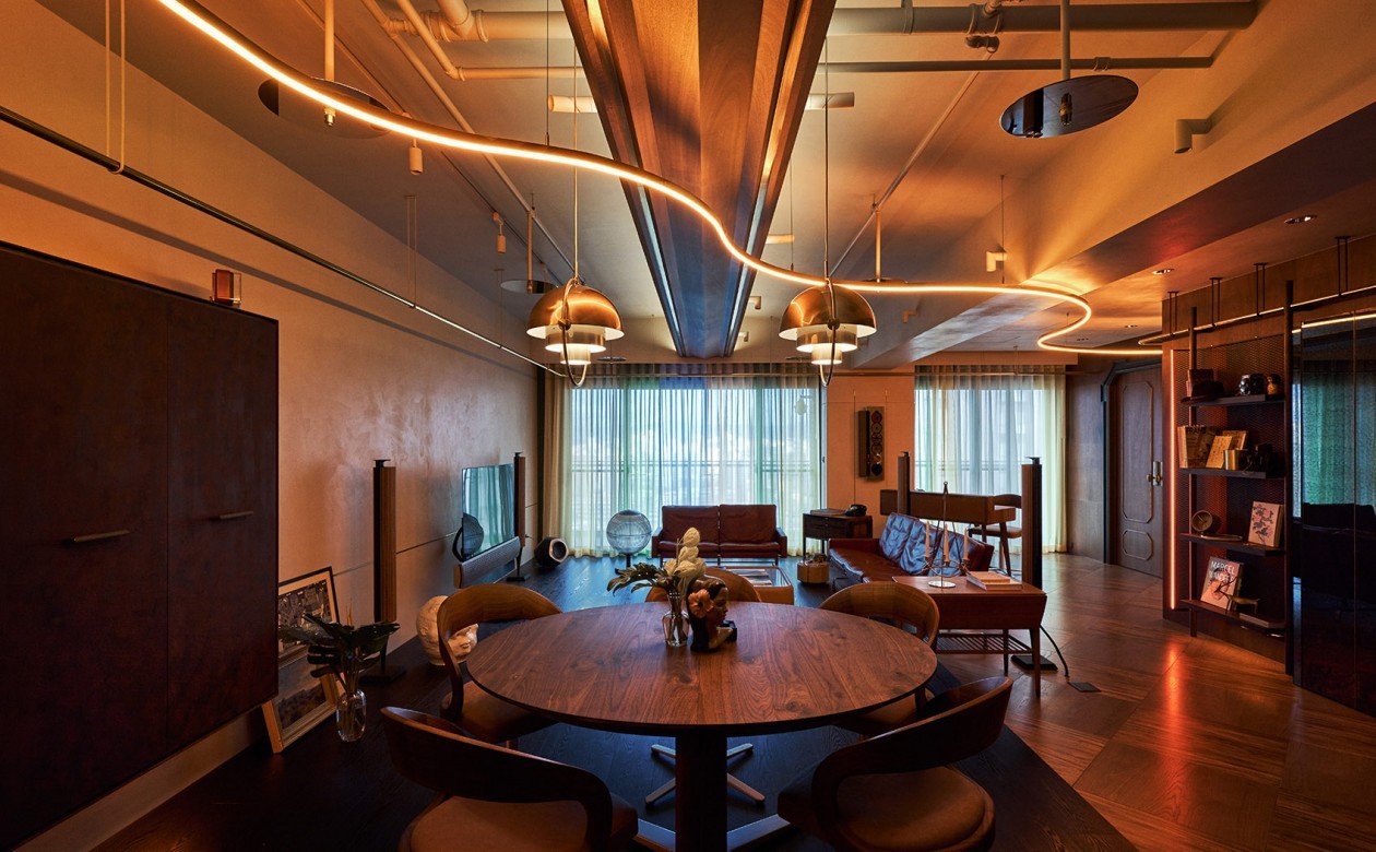 软霓虹灯和客厅装饰的黄铜吊管止于主卧室门口并未穿透的原因,是为了在卧室这样的私密休憩区域,感官上还保留可以让使用者柔软、不紧凑的独立思考空间。