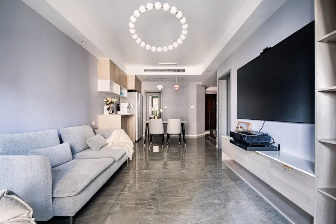客厅整体和餐厅、阳台做了联动打通,背景墙以浅灰色为基调,搭配同色系沙发简净装饰,大理石地砖与鹤望兰营造自然舒适氛围。