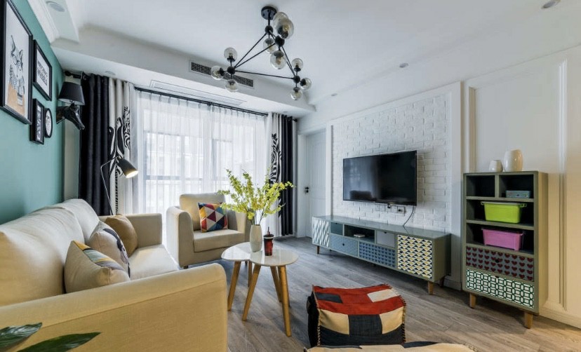 整体案例冷色为主,客厅、主卧贯穿了黄色点缀,让案例生动鲜活起来,融入动物图像的嬉皮感,使得空间毫不费力地融合成一个整体。