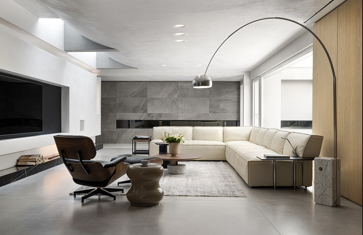 设计师保留原始梁柱,将顶面处理成弧形的建筑体块,与电视机墙体产生空间关系,将混凝土楼板改造成成水景天窗,