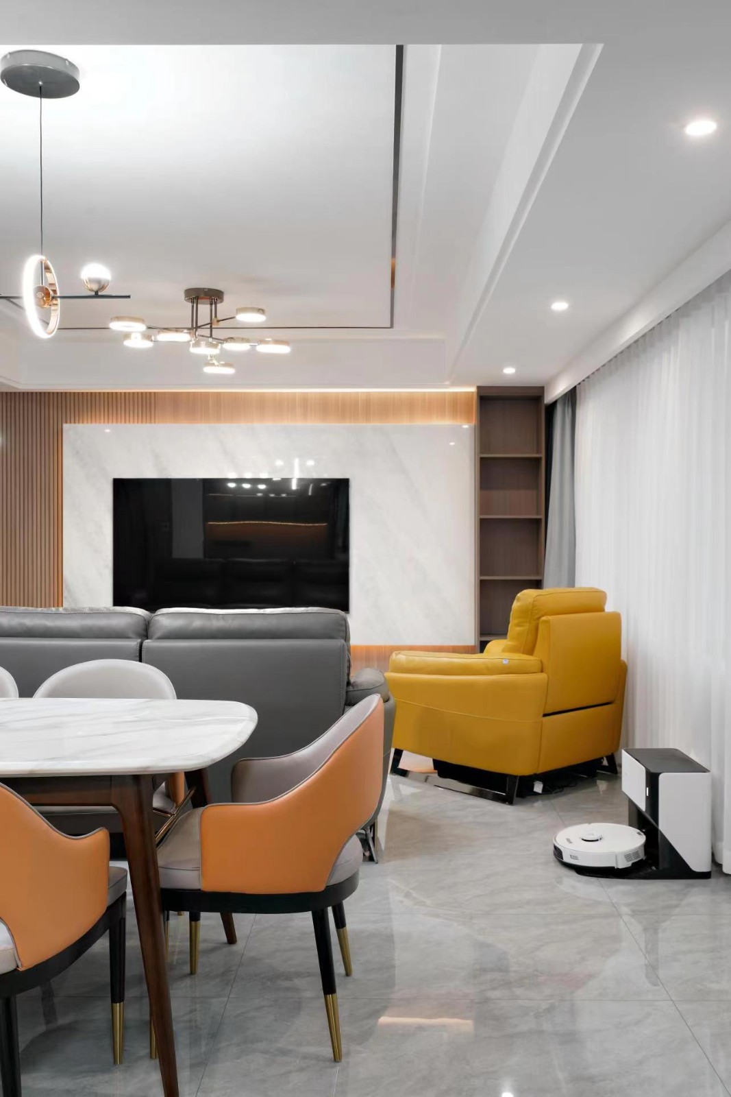 大横厅户型,开放式布局是本期案例的户型特点,设计师王老师以屋主需求为出发点,灵活运用木饰面、岩板、玻璃等材质,为这个家注入了时尚轻奢气韵,优化功能布局的同时,也丰富了居住体验的层次感。