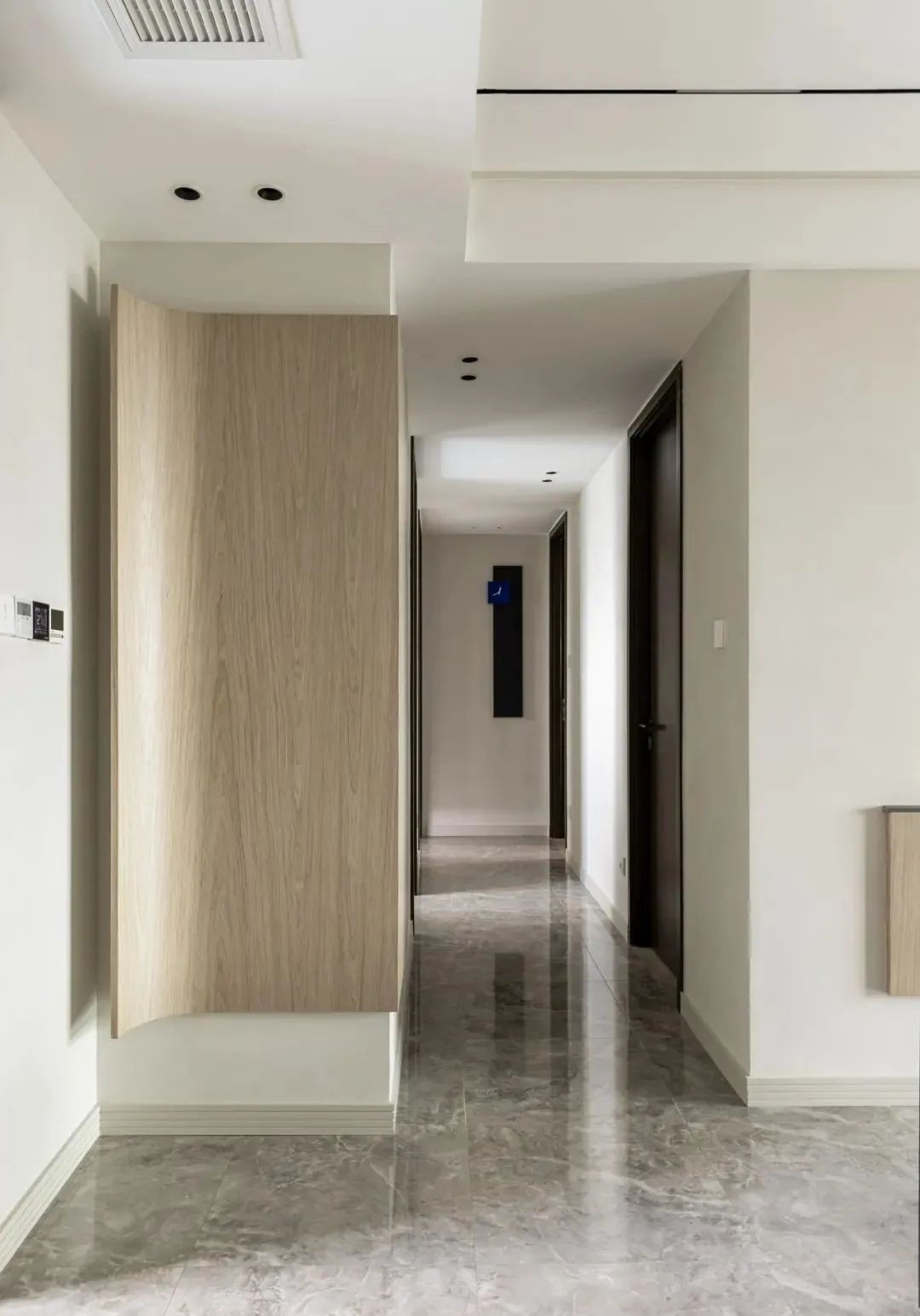 ▲入户没有独立的玄关,在进门正对面安装了弧形饰面板,简约不失设计感。进门右手边打造了玄关柜+换鞋凳的组合,满足了基本的功能需求,让进出门变得更加方便。