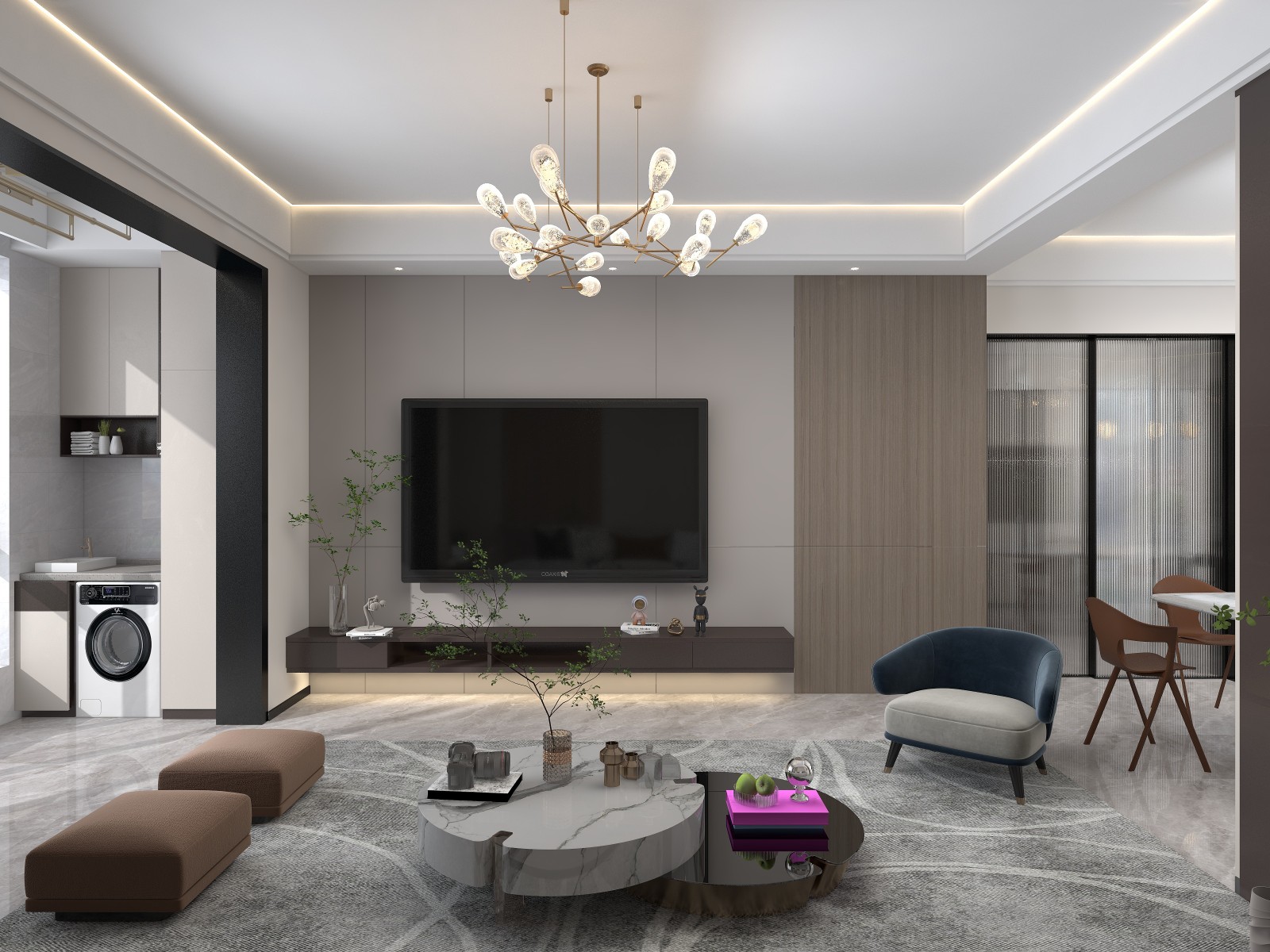 边吊加灯饰,既实惠又美观。木饰面沙发背景墙。