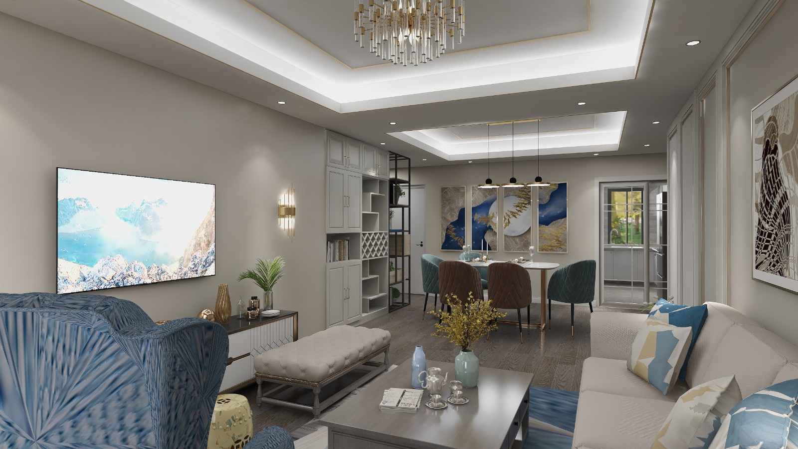 本案户型三房一厨两卫,设计风格为现代轻奢,整体比较柔和,优雅的灰色调与简洁的白色为基调,活跃的蓝色,沉静美好,勾勒出精致惬意的生活缩影