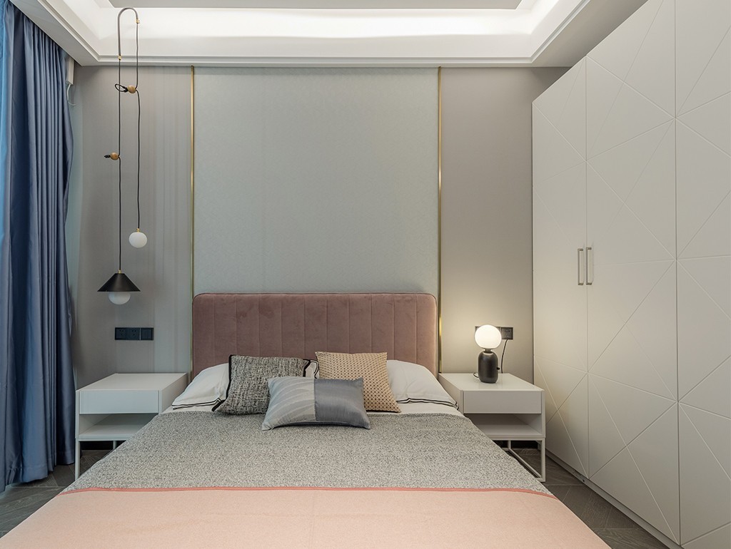 卧室则由莫兰迪粉色形构简洁背景,添入不少具生活质感的家具软装,交织出兼具美观,舒适的质感视野。