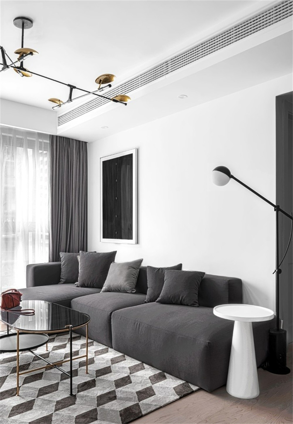 沙发选择了模块化的方便后期调整增减,装饰画的部分运用深色的绉布(类似三宅一生衣服的面料)打底,缝制了黑色的纽扣,原型是一条黑色长裙的束腰部分,将其正面元素抽离平面化设计的,这幅装饰画是购买了原材料现场制作完成