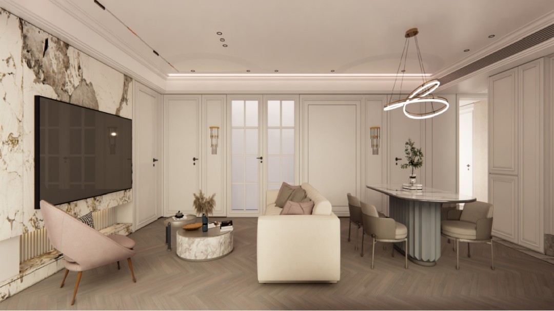 在本案中,设计师以简约、温度为侧重点,利用线性变化将线条在空间中呈现,勾勒出轻盈均衡的艺术感,搭配以素雅的色调营造出空间的灵动柔美