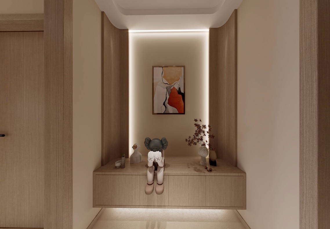 简易的柜体配上弧形的造型,加上个性的摆件,通过灯光的提亮,让每次回家的居住者,心情无比舒畅。。。。。。